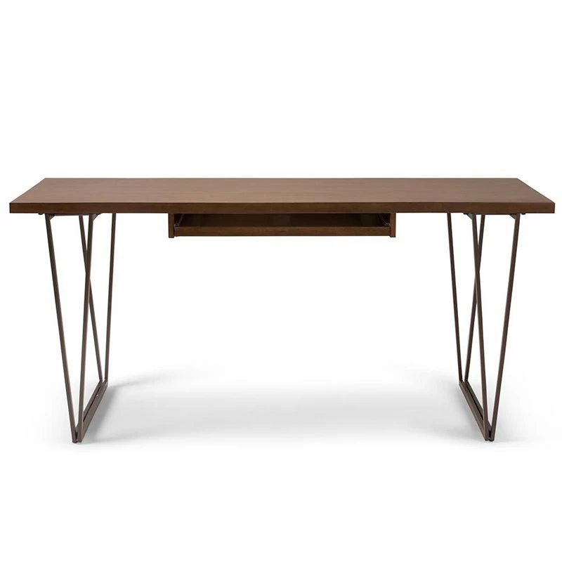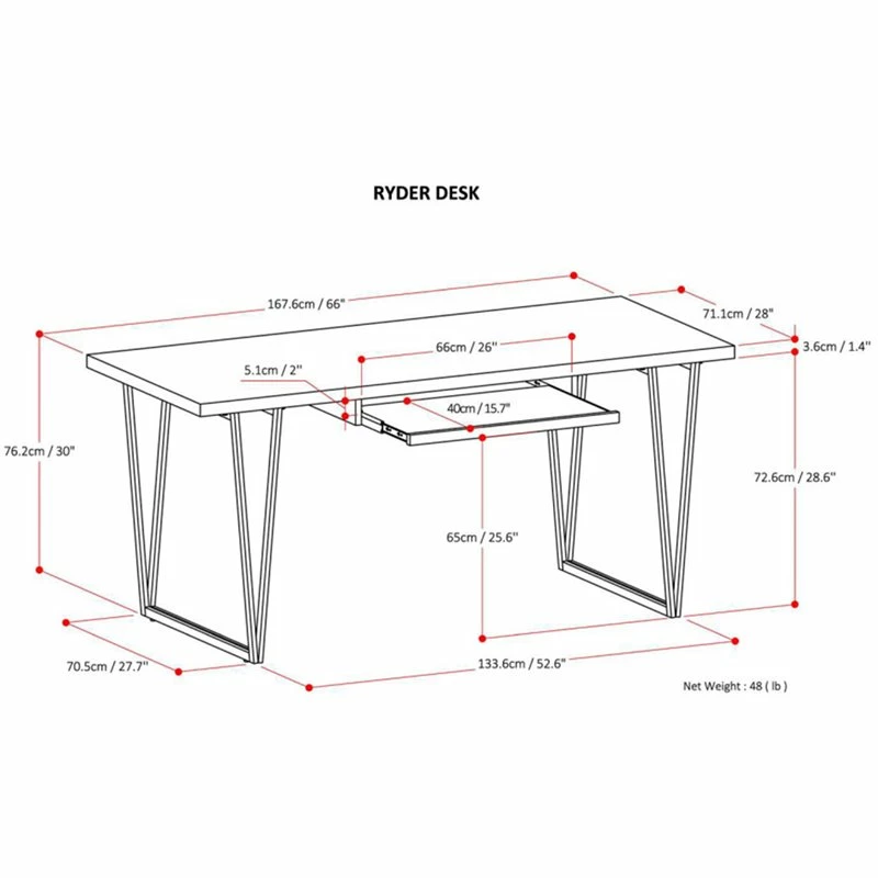 Combine industrial, contemporary style and function with the Ryder Desk. This desk is crafted of solid wood with an unique V design metal base and legs. Generous in size, this steam lined desk offers a spacious top surface and includes a keyboard tray for added convenience.