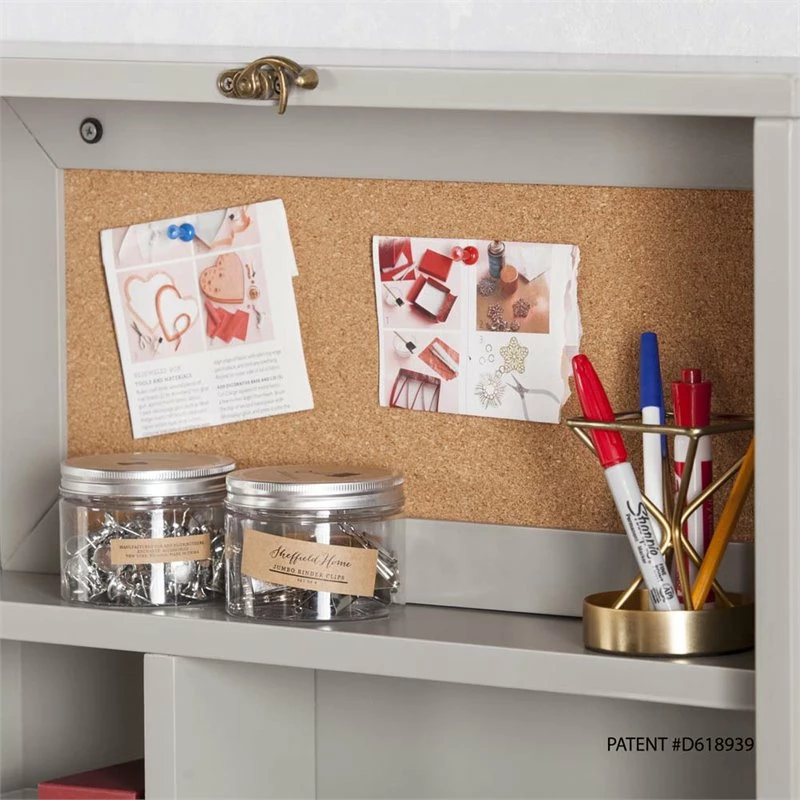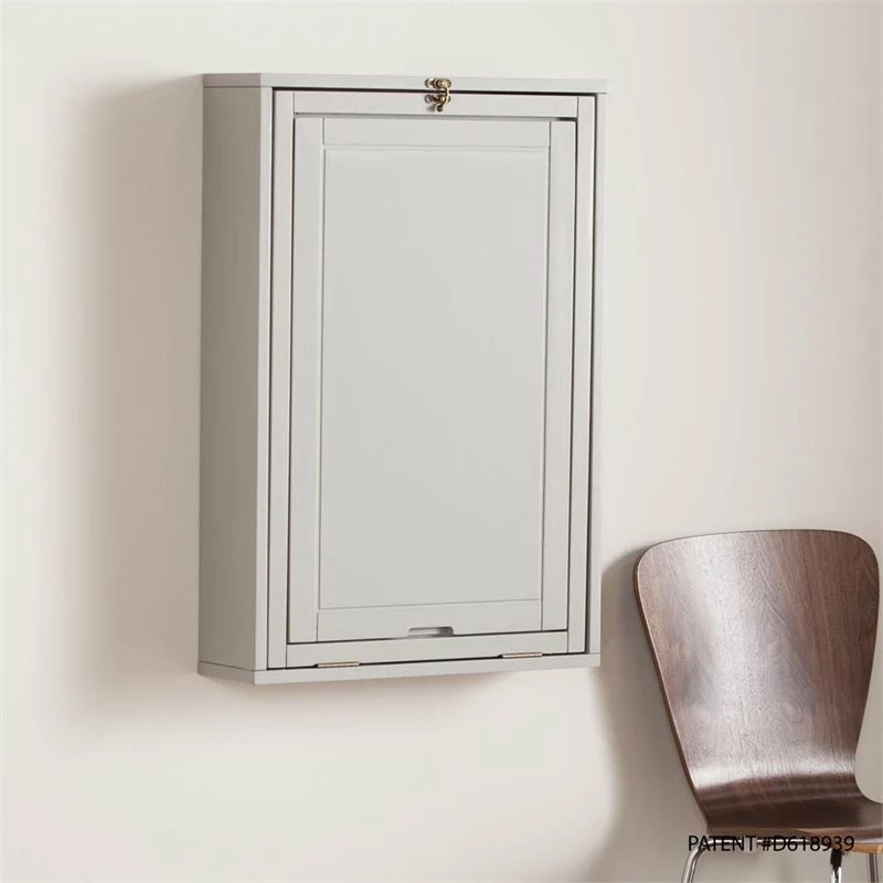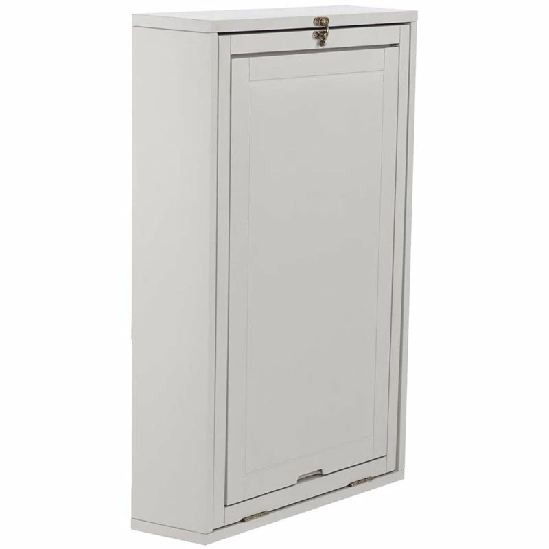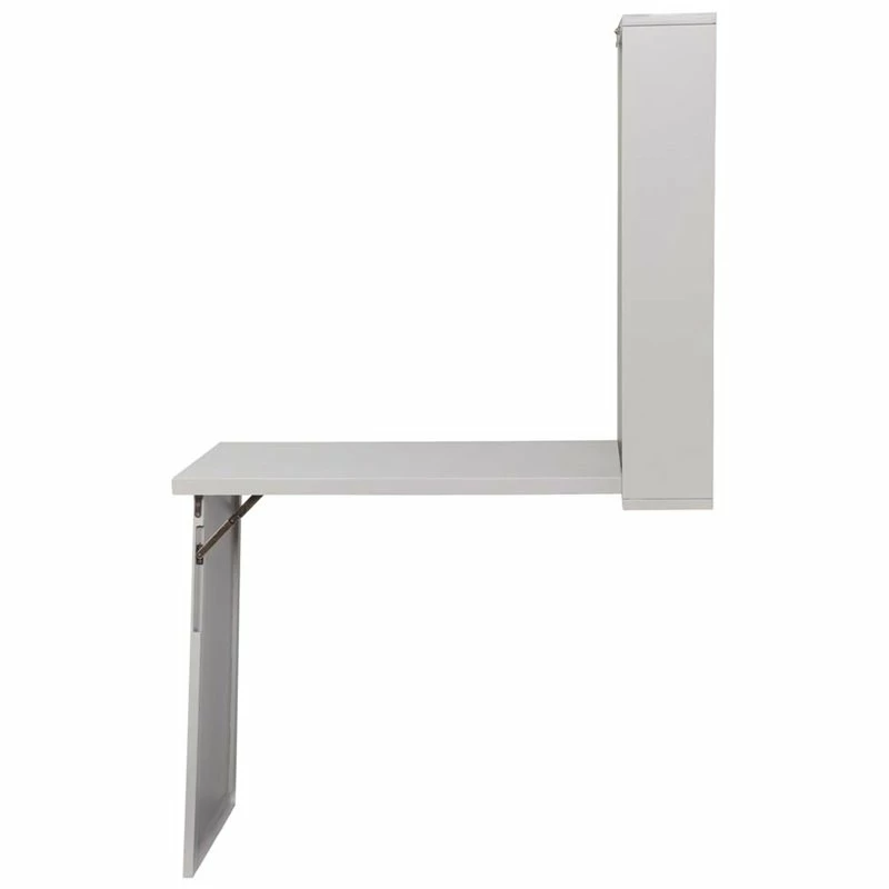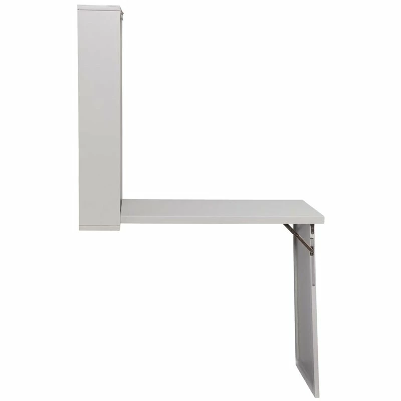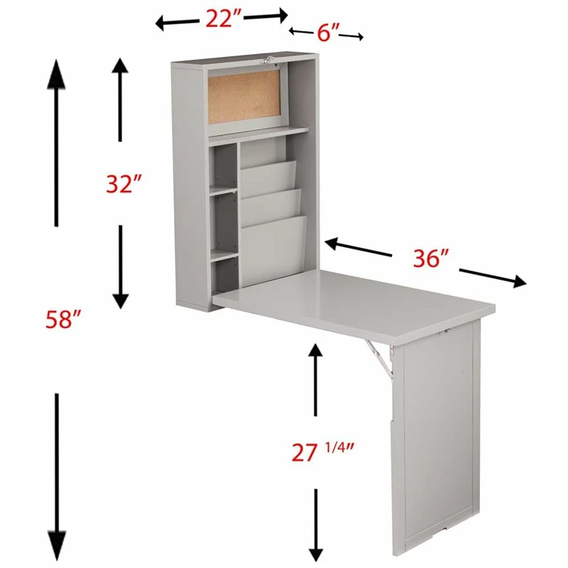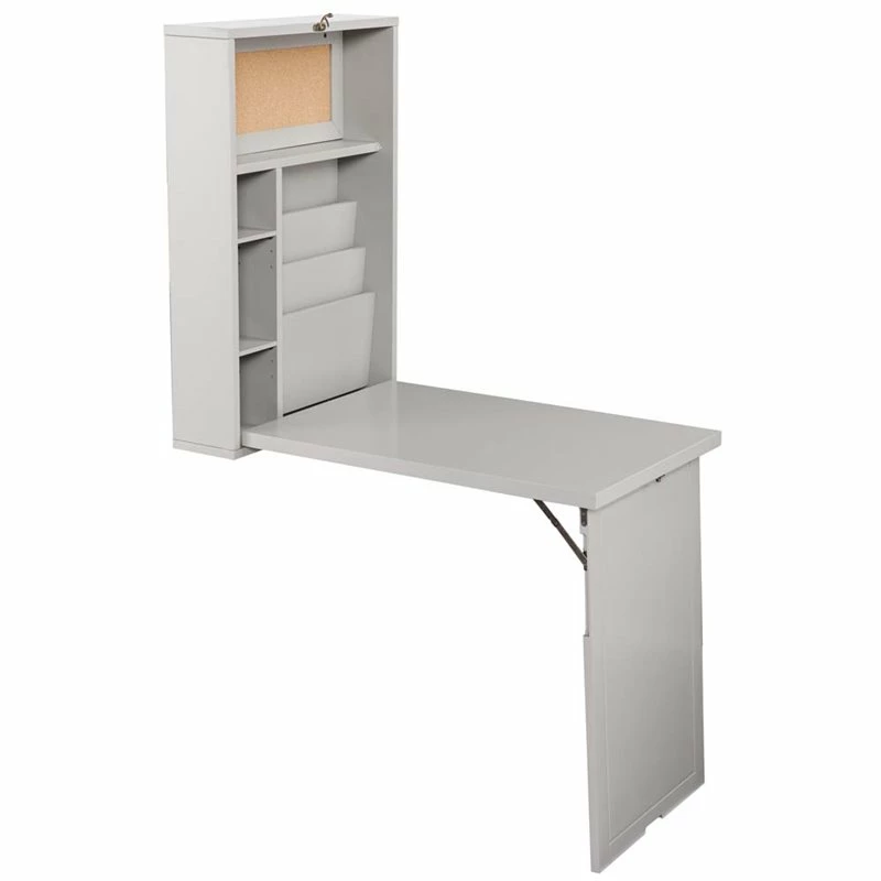 Unfold an organized world with this fold-out floating desk. Fold down desktop and workspace reveals ample storage with adjustable shelving, paper organizers, and even a small corkboard to keep track of your tasks. Elegant and unobtrusive gray hue provides universal style appeal, fold-away design works in even the smallest of spaces. Study smart with this easy to use wall mount desk in the open concept living space or home office.