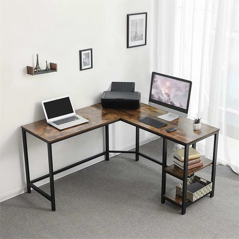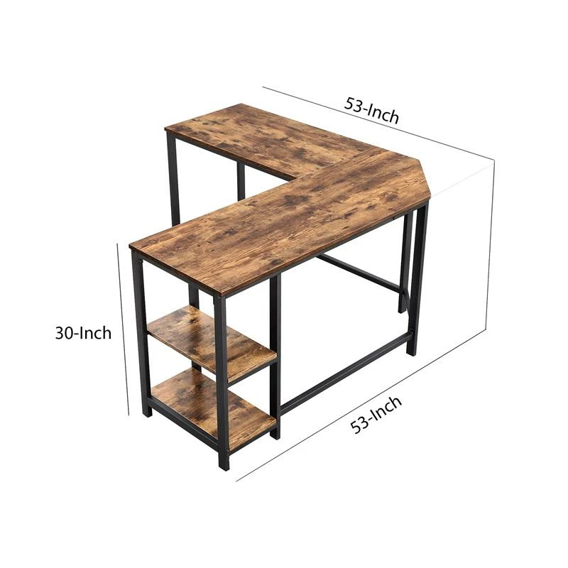 Rejuvenate your work space with the inclusion of this coveted l shape computer desk which offers 2 bottom shelves and incorporates grain details. Constructed from the combination of MDF and metal, it is accented with brown and black finish.