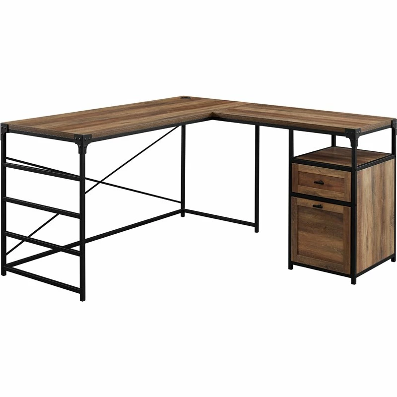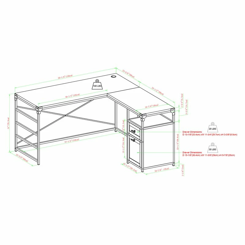 Invite this urban, L-shaped Desk Dimensions to transform your office space into an updated work-from-home sanctuary with its spacious storage capabilities and chic mixed-material silhouette. Every creative’s ideal workspace, this angle iron Desk Dimensions tastefully bridges cool, industrial elements with its metal X detail, and functionality with its L frame and two-drawer filing cabinet. The lower drawer is fit with two convenient and removable metal rods, sized perfectly for hanging folders. Your home office will feel invigorated with the piece’s undeniable urban intrigue.