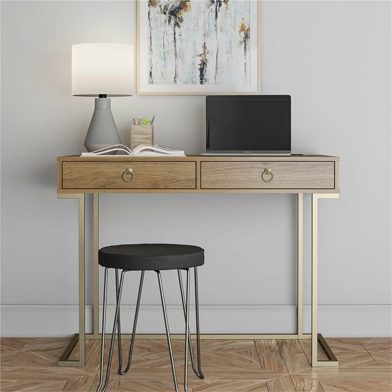 Enhance your home office like a boss with the Urbanpro Computer Desk. The walnut woodgrain finish on the laminated MDF and particleboard pairs well with the gold powder-coated metal legs for a fun and unique look. The gold ring drawer pulls adds a sophisticated touch. Complete with a wireless charging spot, the desktop allows you to charge your phone without the hassle of cords. The 2 drawers offer ample storage space for all of your pens, pencils, and stationary. The Writing Desk ships flat to your door and requires assembly upon delivery. Two adults are recommended to assemble. Once assembled, the Desk measures to be 30.9”H x 41.6”W x 19.7”D.