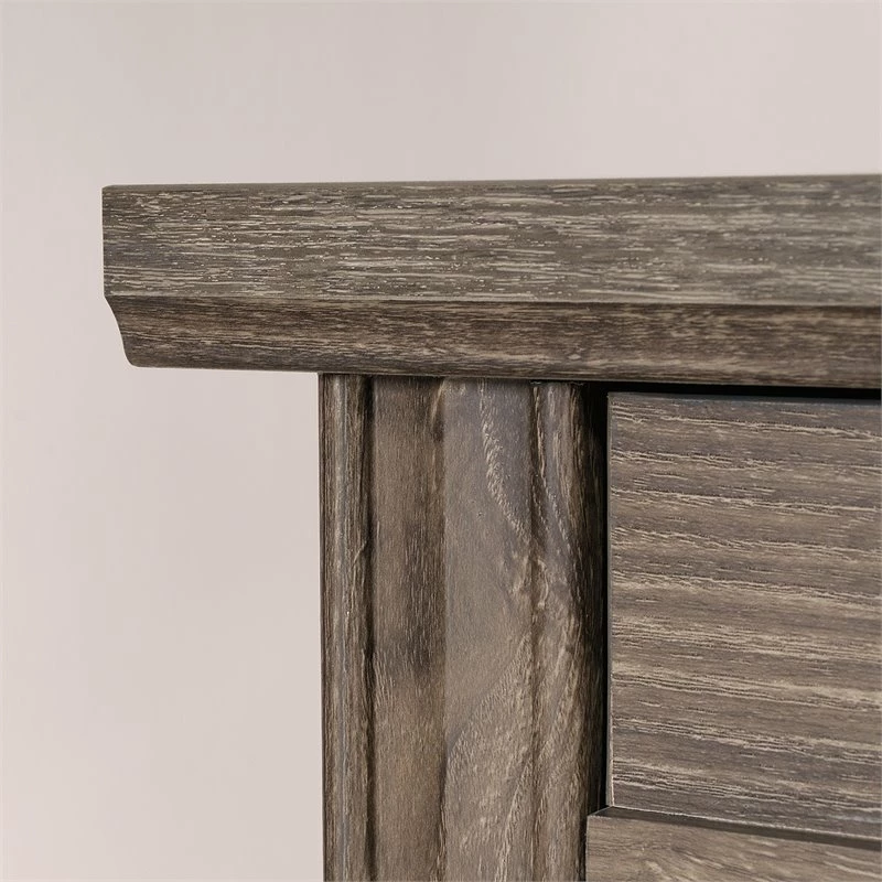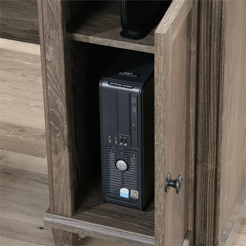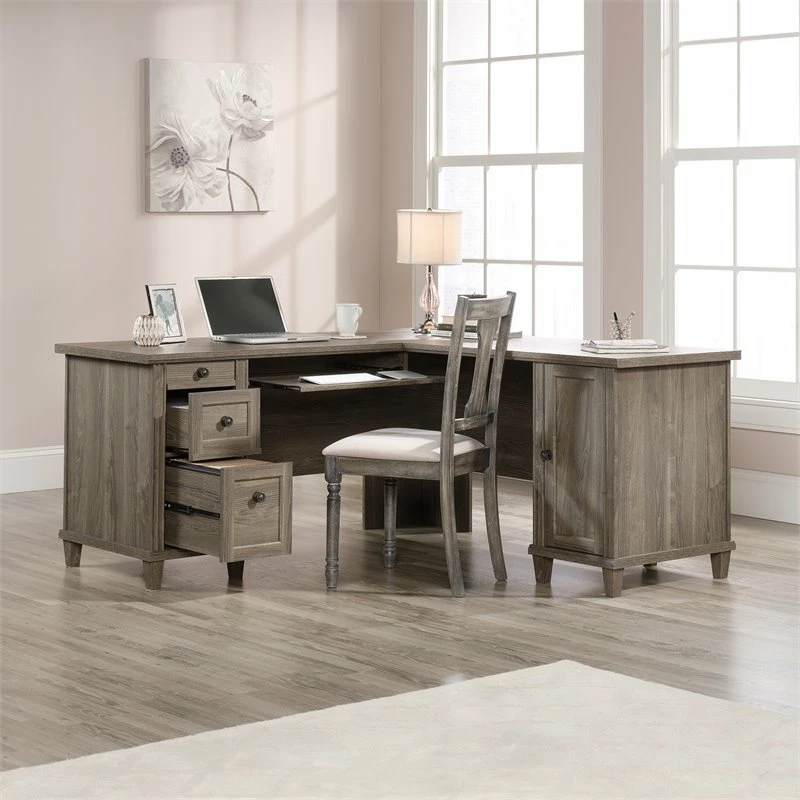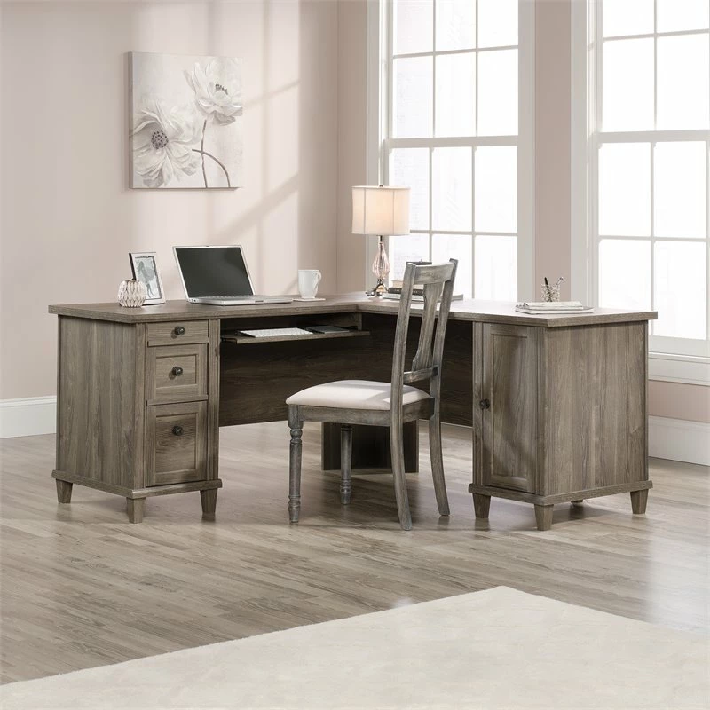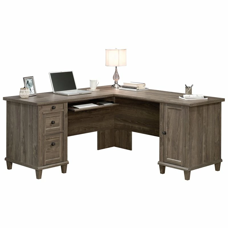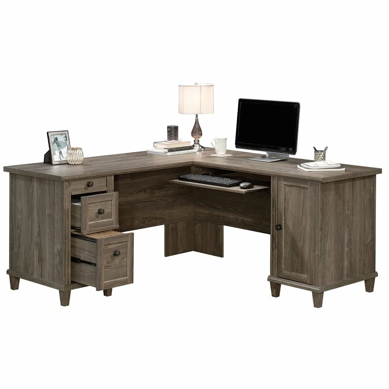 It’s time to give your home office or workspace the promotion it deserves! Add beautiful style and design along with versatile work space with this L-shaped desk from the UrbanPro collection. This corner computer desk features a durable, 1” thick top with a spacious top surface for all your must-have desk essentials like your laptop, your collection of notepads, stacks of work folders and your coffee mug too. There is also room for home décor items like an accent lamp and photos of your family. This home office desk features a slide-out keyboard/mouse shelf that glides on smooth metal runners. It also features three drawers with full extension slides. The lower drawer holds letter or legal size hanging files so you can keep important documents organized. Behind the framed panel door is a hidden storage area that includes an adjustable shelf and can hold a vertical CPU tower. This corner computer desk also features cord management that includes a desktop grommet. This home office computer desk is finished on all sides so it’ll look the part no matter where it stands. Finished on all sides in Emery Oak and detailed with attractive hardware, this good-looking L-shaped desk is just what you’ve been looking for.