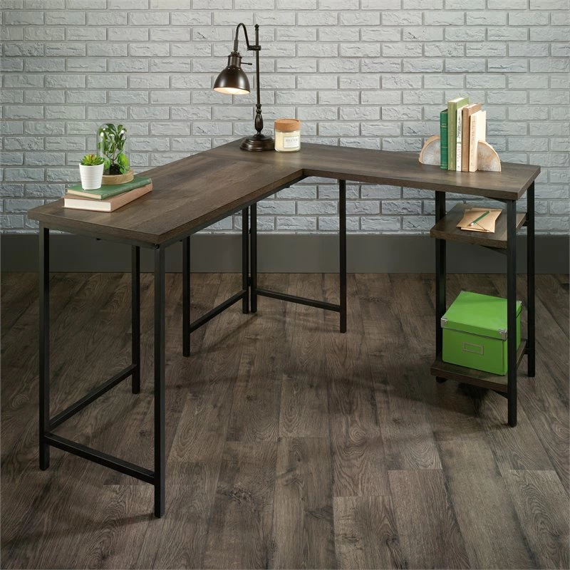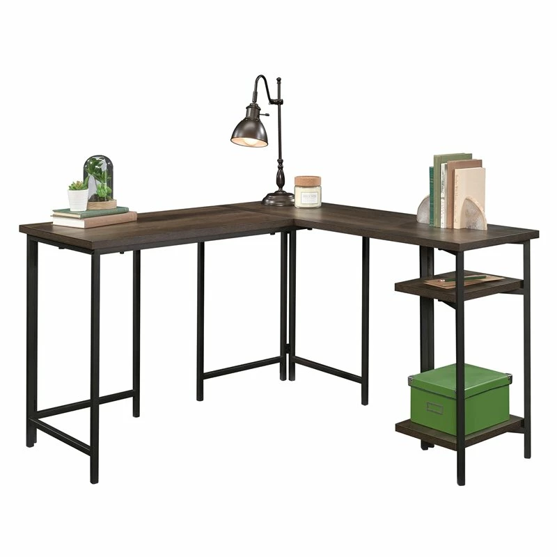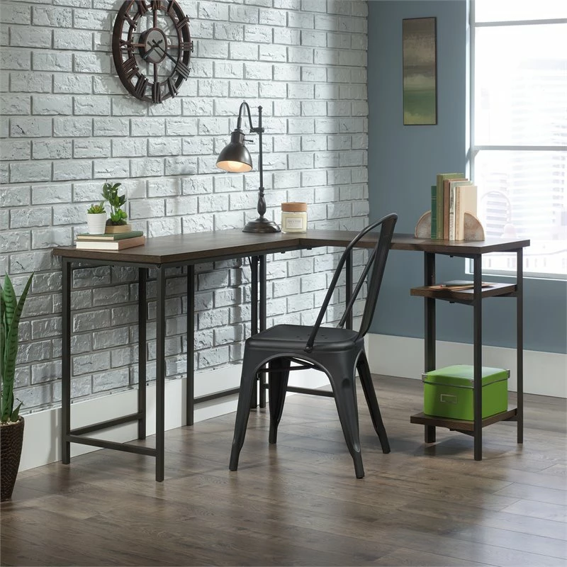 Is the lack of workspace in your home office bringing you down? We can pick you back up! Give your office space the functionality you need with the style that you love with this L-shaped desk from the UrbanPro collection. This home office desk offers a spacious top surface that provides the room you need for all your office essentials like your laptop, stacks of notepads, folders and your hot cup of coffee. You can also find a spot for items like an accent lamp and picture frames too. This computer desk features open storage with fixed shelving for other miscellaneous items like storage bins and work binders. This L-desk features a durable, black metal frame and is finished on all sides for versatile placement throughout your home. Finished in Smoked Oak, this L-shaped desk is just what your office space is missing.