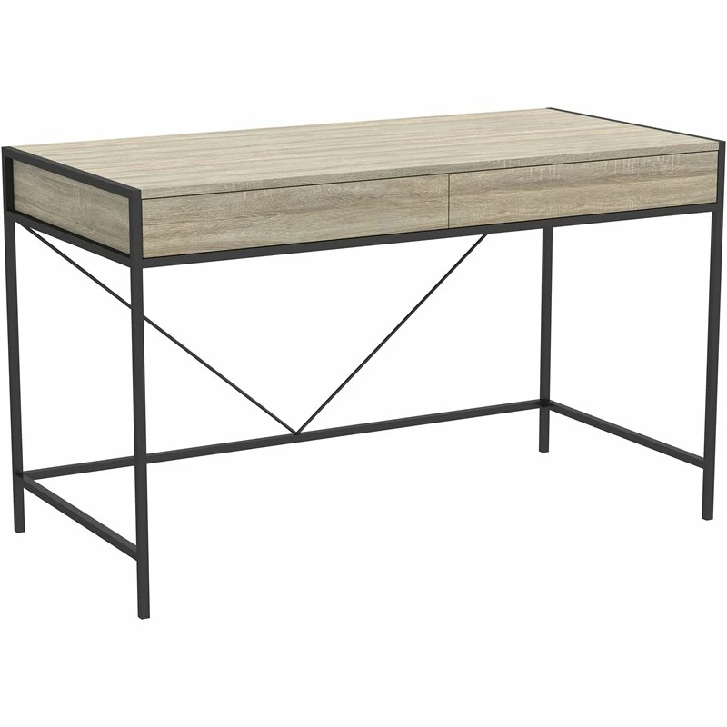 Trendy and modern, this smooth dark taupe computer desk in a wood look grain finish is the perfect combination of function, durability, and design in a stylish form. With clean lines and sturdy black metal legs, this desk will add a sophisticated industrial/modern touch to any office. Featuring 2 storage drawers to help keep you organized, with a large desktop surface to provide plenty of room for all your hardware and working needs.