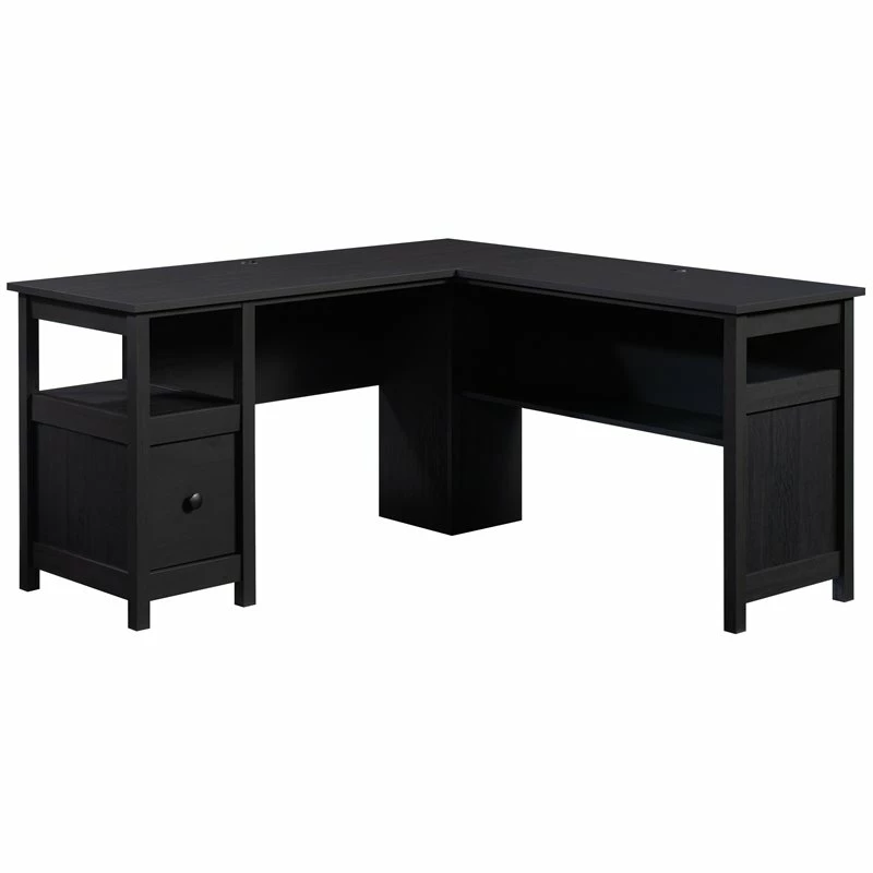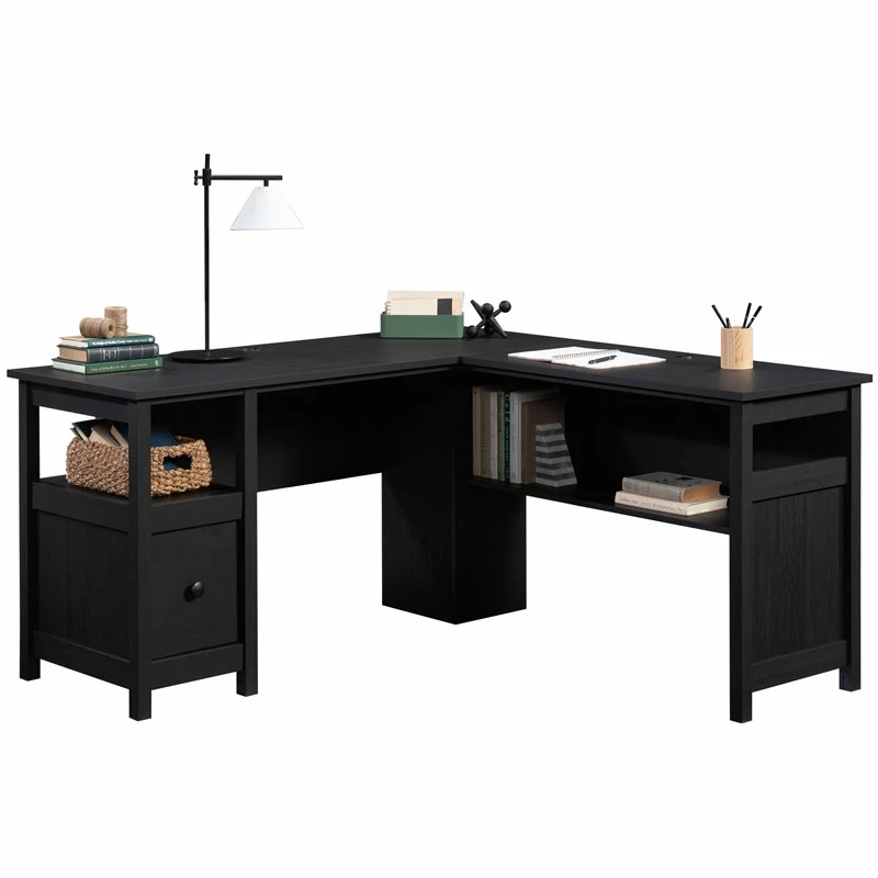 A deep Raven Oak finish sets apart this L-shaped desk from the UrbanPro collection apart and brings a stunning centerpiece to any home office. This l-shaped home office desk features a file drawer with full extension slides that conveniently holds your most important letter-size hanging files. For a tidy workspace, this modern l-shaped desk includes grommet holes and pass-throughs for cord management of your laptop charger and power cord, your lamp, and more. A lower open storage shelf is ideal for books, a small organizing bin, binders, or home décor. The spacious top surface of this l-shaped desk with storage easily accommodates your computer, photos of your family, your coffee cup, and other home office necessities. This small office desk is finished on all sides for versatile placement in any room of your home. Get to work quickly with a T-lock drawer system that makes assembly a breeze. Elevate your home office with the good looks and convenience of this l-shaped desk.