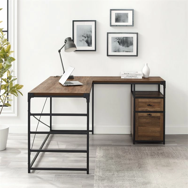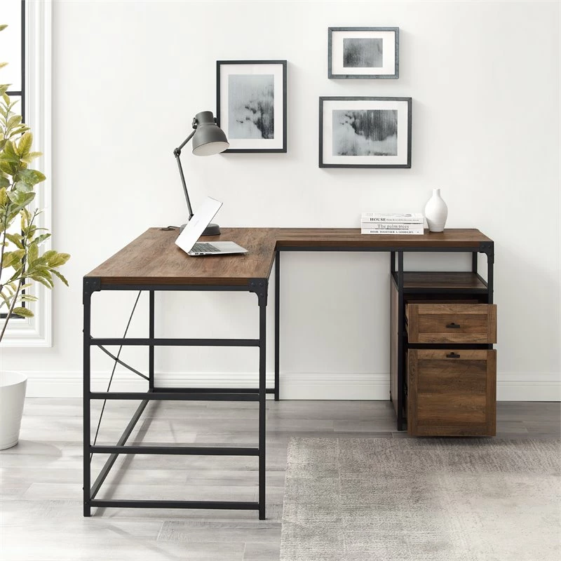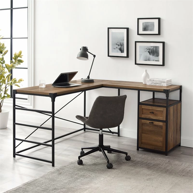 Invite this urban, L-shaped Desk Dimensions to transform your office space into an updated work-from-home sanctuary with its spacious storage capabilities and chic mixed-material silhouette. Every creative’s ideal workspace, this angle iron Desk Dimensions tastefully bridges cool, industrial elements with its metal X detail, and functionality with its L frame and two-drawer filing cabinet. The lower drawer is fit with two convenient and removable metal rods, sized perfectly for hanging folders. Your home office will feel invigorated with the piece’s undeniable urban intrigue.