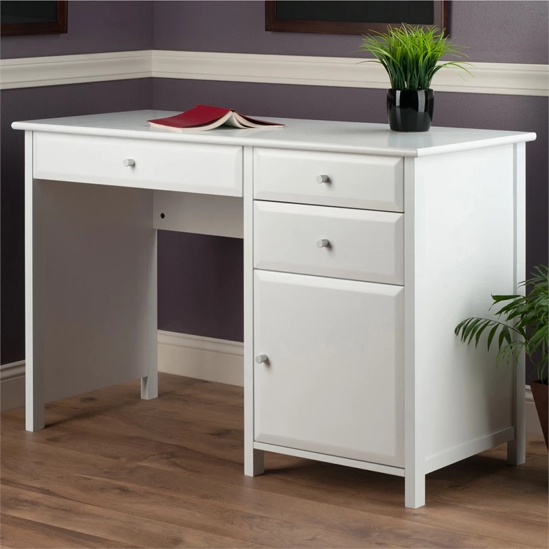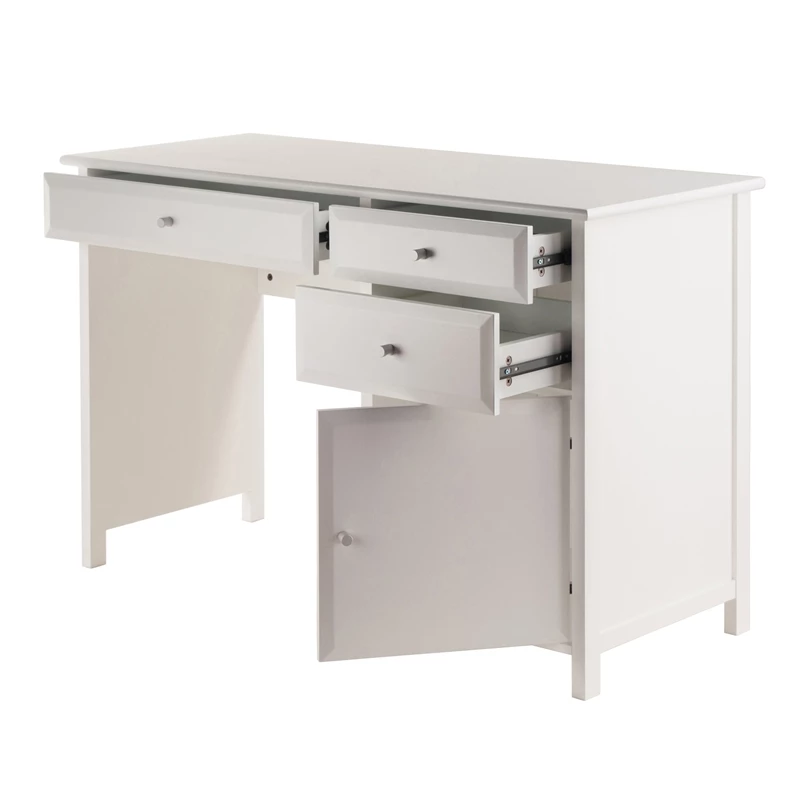 The Winsome Delta Writing Desk offers a contemporary, polished look for your workspace. A perfect complement to any decor, use it in your in-home office, dorm room or den to catch up with paperwork. The desk features a cabinet and three soft-close drawers that glide on metal rails. Keep smaller office supplies like pens, pads, and staplers organized and handy in the two smaller side drawers. The larger drawer is perfect for storing a laptop, tablet or other smart gadgets. The larger cabinet door opens up providing ample spaces for office supplies and more. The polished, sleek white finish and silver accent knobs give this multifunctional desk a handsome, yet understated look. Create a relaxed setting by completing your office space with the additional items from the Winsome Delta collection (each sold separately). Constructed of sturdy of composite wood. Conveniently packed and shipped in 1 box, that includes the hardware necessary for assembling. Replacement part request can be submitted directly to the manufacturer, with sales receipt, within 60 days from date of purchase.
